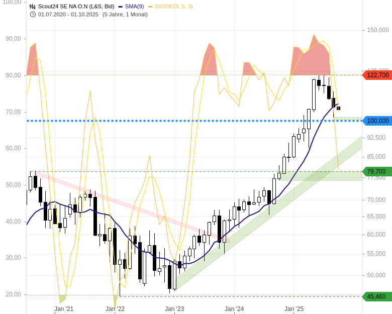 Korrektur bei der Scout24-Aktie: Nach dem Allzeithoch bei 122,70 EUR im Juli rutschte die Aktie bis 101,60 EUR zurück, ein Minus von 17,2 %. Damit hat sich die runde 100er-Marke als Support behauptet. Aktuell schiebt sich die 200-Tage-Linie bei 105,10 EUR nach oben, ein klarer Schlüsselbereich. Das Mittwochstief traf die Linie punktgenau, was ihre Bedeutung zusätzlich unterstreicht.