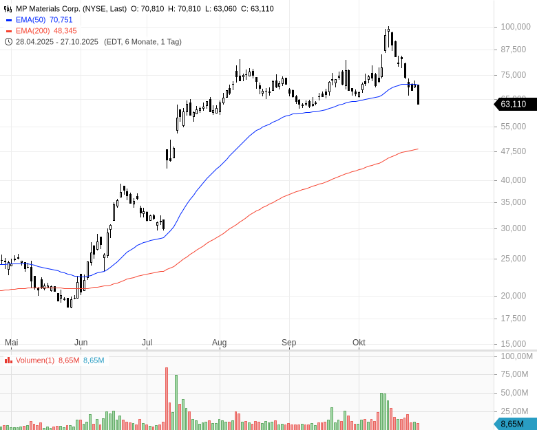 - MP Materials Corp.Kursstand: 63,170 $ (NYSE) - Zum Zeitpunkt der VeröffentlichungVerkaufenKaufen