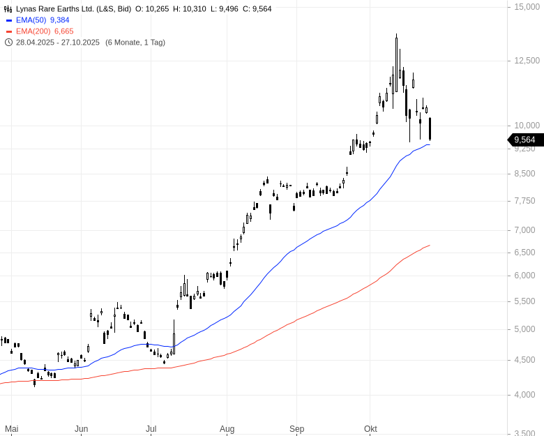 Nachdem nun eine vorläufige Einigung zwischen den USA und China im Handelskonflikt erzielt werden konnte, geht es nun wieder kräftig abwärts mit den zuvor gehypten Papieren. US-Finanzminister Bessent äußerte die Erwartung, dass China geplante Exportbeschränkungen für Seltene Erden im Rahmen eines Handelsabkommens vorerst aussetzt. Das lässt die Sorge vor Versorgungsengpässen vorerst schwinden.