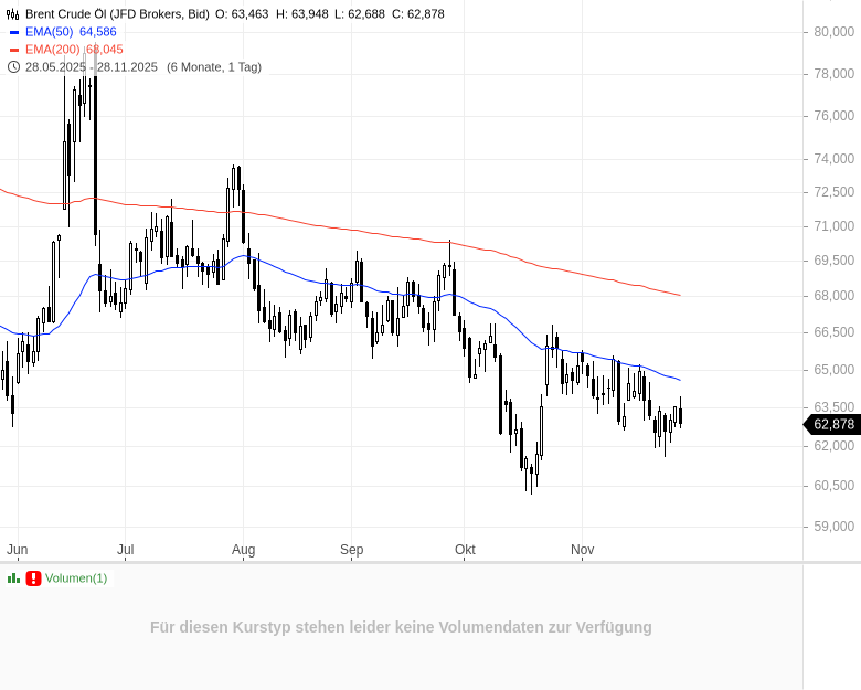 - Brent Crude ÖlKursstand: 64,099 $/bbl. (JFD Brokers) - Zum Zeitpunkt der Veröffentlichung