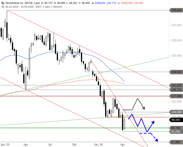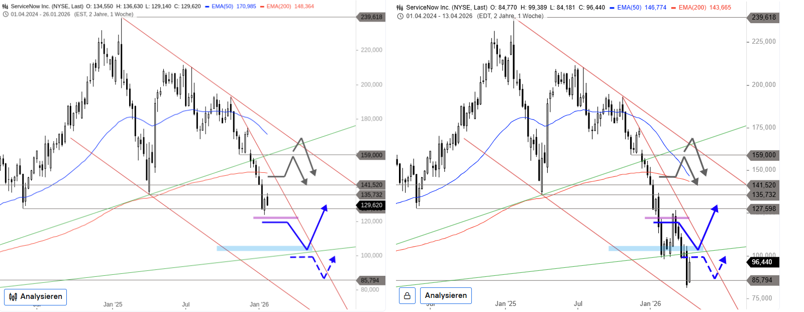 Der gewaltige, am Allzeithoch bei 239,61 USD im Januar letzten Jahres begonnene Abverkauf hatte die Aktie von ServiceNow zu Jahresbeginn unter die mittelfristige Aufwärtstrendlinie und die Tiefs aus dem April 2025 und Mai 2024 bei 135,73 und 127,59 USD einbrechen lassen.