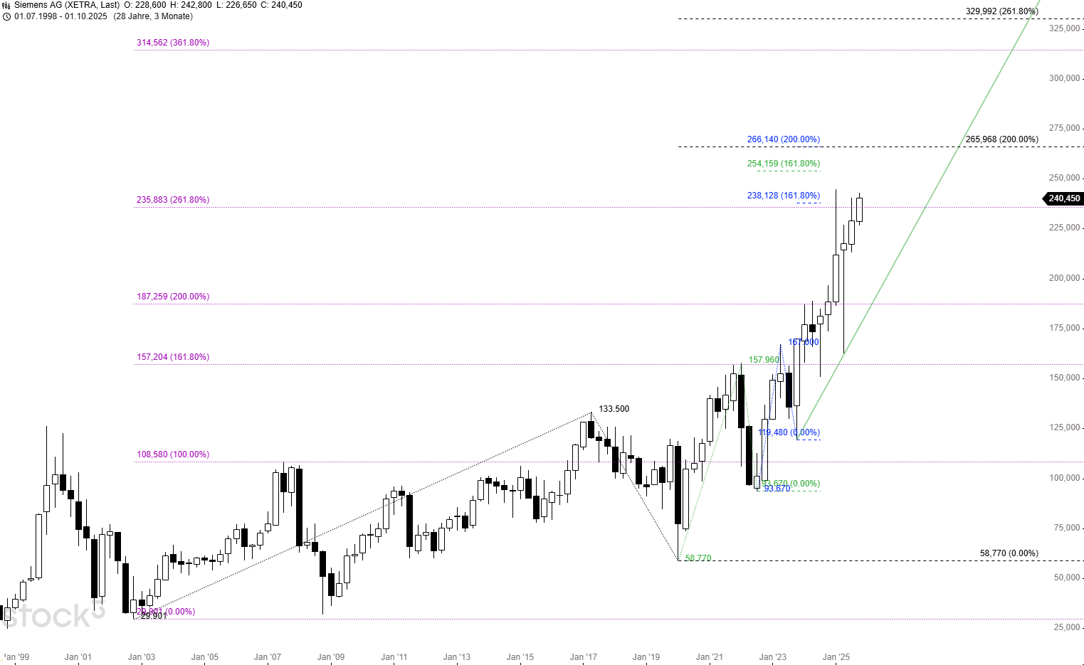 Charttechnisches Fazit: Kurzfristig könnte der laufende Aufwärtsimpuls bei einem Ausbruch über 244 bis 248 EUR eine langfristige Weichenstellung einleiten. Allerdings muss die Siemens-Aktie eine ganze Armada von Zielmarken überwinden, um sich auch im großen Bild weiter nach Norden orientieren zu können. Dafür hätte der Kurs oberhalb von 266 EUR sogar Platz bis 300 und 315 EUR.
