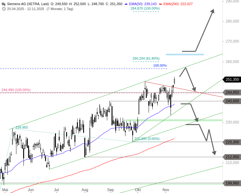 Nach der impulsiven Aufholjagd im April und Mai ging die Aktie von Siemens in einer volatile Seitwärtsphase über, die zwar immer wieder neue Hochs ausbildete, doch erst ab Ende September an die Dynamik des Frühjahrs anknüpfen konnte. Mit dem Ausbruch über das Allzeithoch bei 244,85 EUR folgte das erwartete neue Hoch im Bereich von 248 EUR, welches allerdings im Oktober direkt wieder abverkauft wurde.