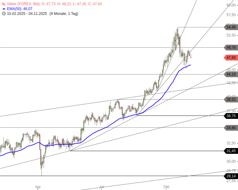 Gelingt es Silber, die Marke von 50 USD wieder zu überwinden, könnte die Rally fortgesetzt und ein Anstieg in Richtung 54,48 USD sowie darüber hinaus eingeleitet werden. Bleibt ein Ausbruch aus, wäre eine zweite Abwärtswelle ausgehend vom Widerstand bei 50 USD nicht auszuschließen. Diese könnte den Kurs nochmals in Richtung 44,19 USD führen. Auch in diesem Fall bliebe der mittelfristige Aufwärtstrend, der aktuell bei rund 41,90 USD verläuft, übergeordnet intakt.