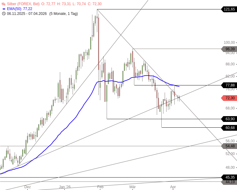 Nach dem Einbruch auf 60,68 USD bewegte sich Silber wieder nach oben. Die Erholung verlief dynamisch, scheiterte jedoch im Bereich der Widerstandszone bei 77,88 USD. In der Folge setzte eine erneute Konsolidierung ein.