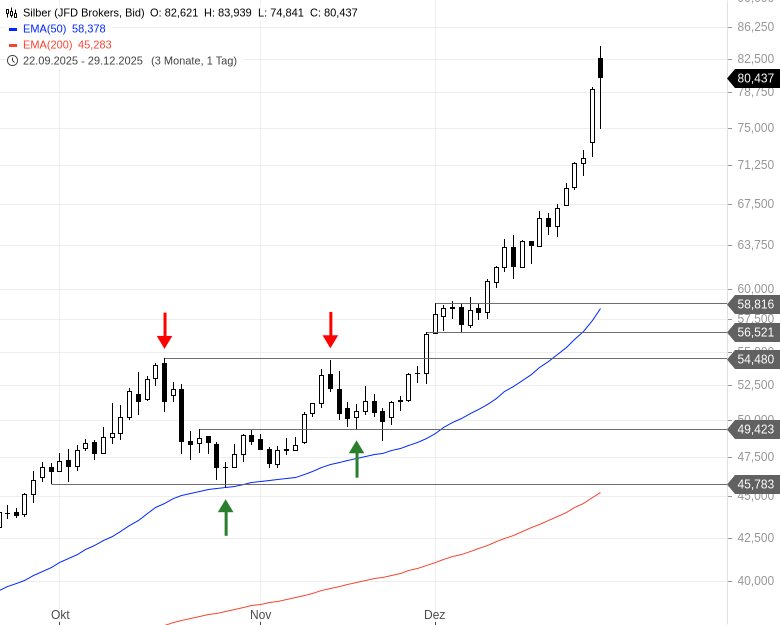 Kurzfristig würde ich in jedem Fall (Teil-)Gewinne auf der Long-Seite realisieren. Die guten Einstiege im Silberpreis liegen aus tradingtechnischer Sicht bereits lange hinter uns. Es wird aber 2026 wieder neue Chancen geben.