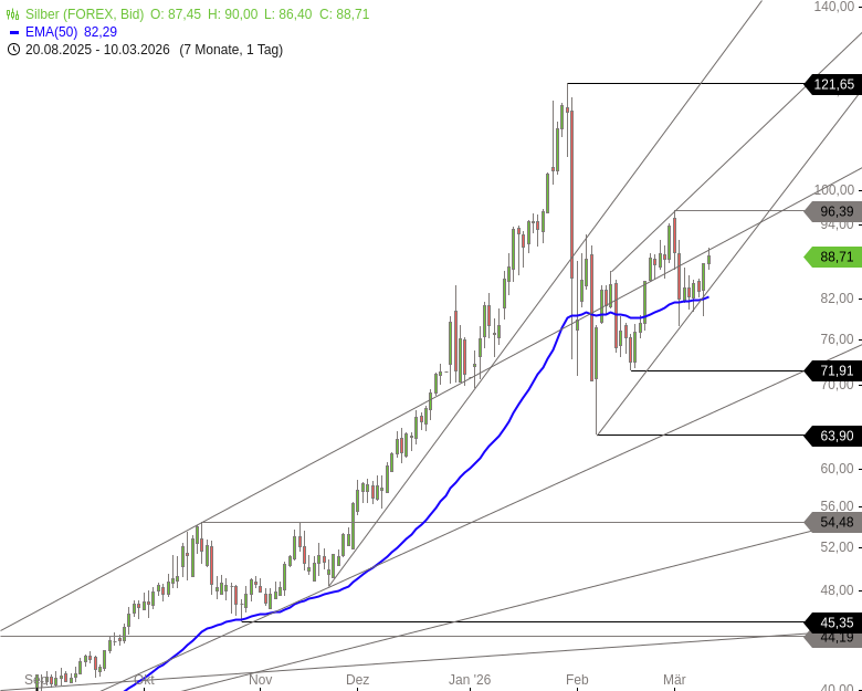 Solange Silber oberhalb des EMA50 und damit über der kurzfristigen Trendstruktur bleibt, bleibt das übergeordnete Bild konstruktiv. Erst ein Bruch der Zone um 79,00 USD würde die Aufwärtsstruktur deutlich schwächen.