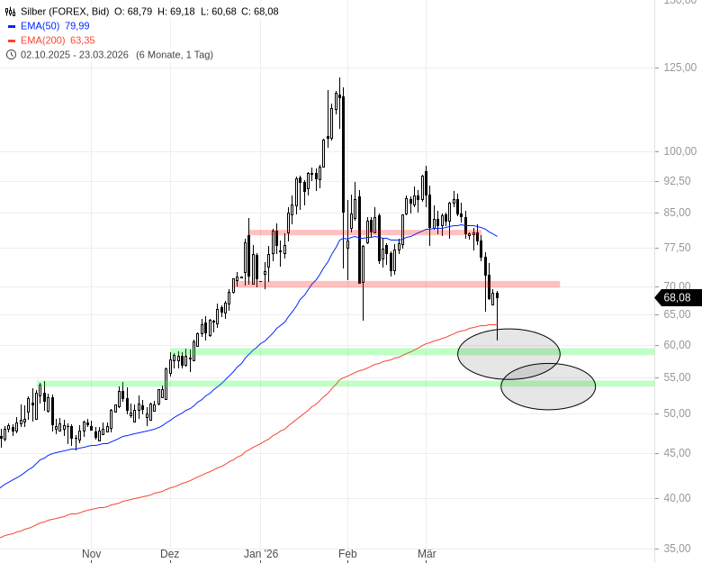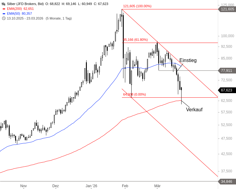 Was war Alex' Szenario? Der Silberpreis war am Allzeithoch extrem überkauft. Im langfristigen Kontext ist er das immer noch. Nach einem ersten Abverkauf auf 64,01 USD erholte sich der Silberpreis bis an das logarithmische 61,8%-Retracement bei 96,17 USD. Dort schwenkte er in eine Seitwärtsbewegung ein. Am 18. März löste er diese mit dem Rückfall unter die Unterstützung bei 77,91 USD nach unten auf. Dieser Durchbruch war ein Verkaufssignal mit einem Mindestziel bei 64,01 USD. Das Ziel wurde heute Morgen unterboten und Alex sackte den Gewinn von fast 200 % mit seinem Hebelprodukt ein.