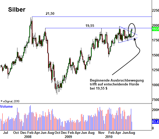 Beachten Sie aber die Bedingung. Der Silberpreis muß nachhaltig über 19,55 $ ansteigen können! Aufgrund der richtungsweisenden Relevanz der 19,55 $ Marke sollten Sie durchaus erste Fehlausbrüche einkalkulieren. Eine große Chance wartet auf Sie, Sie wissen aber auch, dass nun die echte Herausforderung das sinnvolle Wahrnehmen dieser Chance ist. Wer zu gierig ist, wird früher oder später vom Markt bestraft.