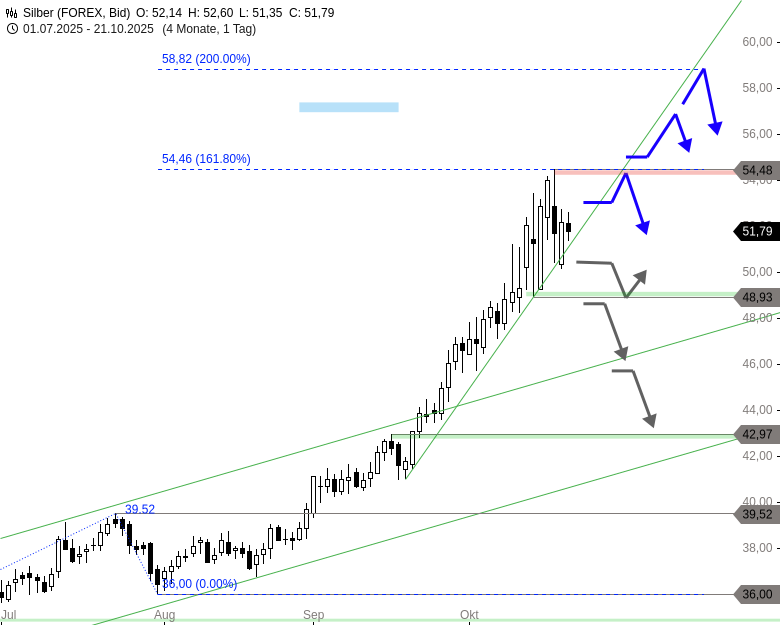 Rückblick: Mit dem Ausbruch über den langfristigen Widerstand bei 34,86 USD wurde im Juni eine exorbitante Rally bei Silber losgetreten, die binnen weniger Wochen über die Kursziele bei 40,60 USD und 45,50 USD führte. Nachdem zuletzt auch die 50,00-USD-Marke und damit auch das Projektionslevel bei 49,32 USD überrannt worden waren, erreichte der Kurs des Edelmetalls die 161,8%-Fibonacci-Projektion der Rallyphase von April bis Juni bei 54,46 USD und setzte dort am vergangenen Freitag zu einer ersten Korrektur an.