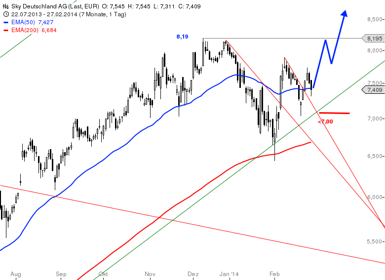 Am 09. Dezember 2013 erreichte die Aktie von Sky ein Hoch bei 8,19 Euro. An diesem Hoch scheiterte die Aktie Ende Dezember 2013. Danach drehte der Wert nach unten und testete den Aufwärtstrend seit Dezember 2011. Seit diesem Test steigt der Wert unter Schwankungen wieder an. Das Hoch bei 8,19 Euro hat der Wert allerdings noch nicht erreicht.