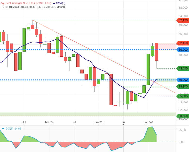 Ich möchte heute vielmehr den Blick auf die Aktienkursentwicklung eines Öl-Dienstleisters richten. Konkret geht es um die Aktie der SLB N.V., früher bekannt als Schlumberger. Der Titel reagiert besonders sensibel auf Bewegungen am Ölmarkt. Allein am Dienstag legte die Aktie an der NYSE um 2,6 % zu und rückte damit wieder stärker in den Fokus vieler Investoren.