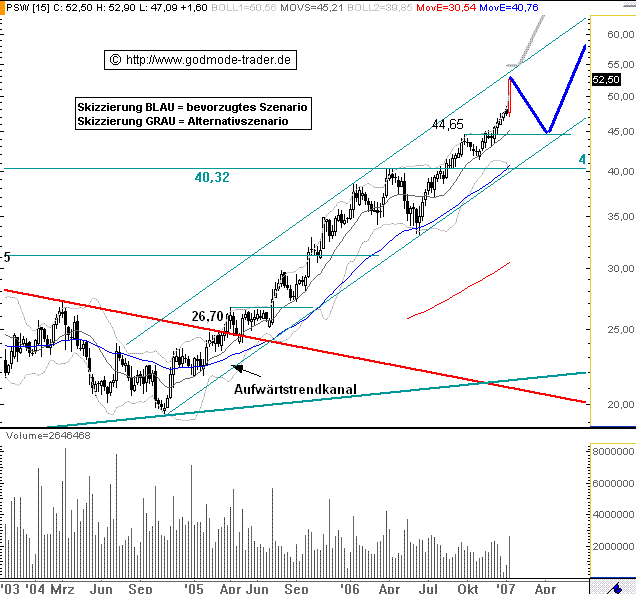 Rückblick: Die SODEXHO ALLIANCE Aktie sollte nach dem Ausbruch über die Marke bei 40,32 Euro aus dem August 2006 deutlich anziehen und bis zur oberen Begrenzung der langfristigen Aufwärtsbewegung seit Oktober 2004 ansteigen. Aktuell liegt diese Begrenzung bei 53,66 Euro. Mit einer extrem langen weißen Kerze nähert sich die Aktie dieser oberen Begrenzung in der laufenden Woche stark an. Dabei steigt die Aktie über die klar aufgeweiteten Bollinger Bänder an.