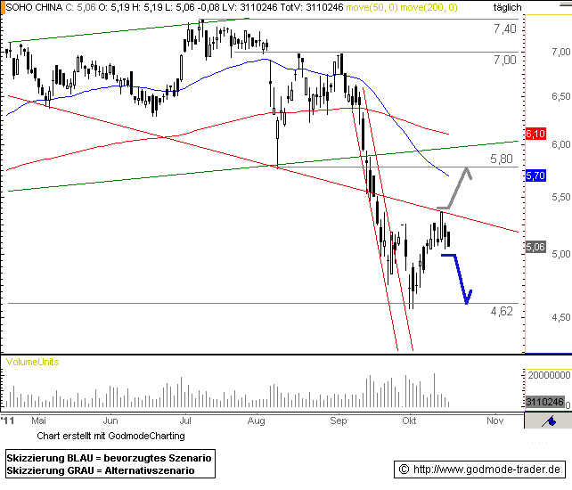Nach einem bullischen Aufstieg vom letzten Tief bei 4,62 $ ist die Aktie des Immobilienkonzerns SOHO China bei 5,35 $ an eine fallende Trendlinie gestoßen, die einen Widerstand darstellt. Hier begann deswegen eine Wende, die den Kurs in den letzten beiden Handelstagen gedrückt hat.