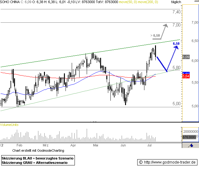 Auf seinem Weg nach oben orientiert sich der Kurs von SOHO China an einer Trendlinie, die ihm derzeit wieder als Grenze dient. Mit einer Aufwärtsbewegung, die im Juni begann, ist der Kurs zuletzt an die Trendlinie herangerückt und hat dort eine heftige Gegenreaktion gezeigt. Bei 5,80 $ hatte die letzte Linie gelegen, die ihm jetzt als Unterstützung dienen könnte.