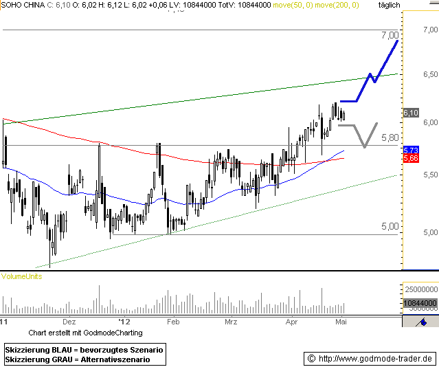 Nach einer monatelangen Seitwärtsbewegung, in der der Kurs von SOHO China im Wesentlichen zwischen 5,00 $ und 5,80 $ hin und her gelaufen ist, startete im April endlich eine sanfte Aufwärtsbewegung. Auch der 200-Tage-Durchschnitt (rot), der die längerfristige Tendenz im Kursverlauf misst, hat inzwischen nach oben gedreht. Über dem Szenario liegt eine aufwärts gerichtete Trendlinie, die die nächste Begrenzung darstellen könnte.