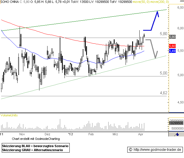 Die Aktie von SOHO China entwickelt sich weiter stabil. Die Kursbewegung läuft zwar im Wesentlichen seitwärts, auf der Unterseite können die Anleger ihre Hoffnungen auf steigende Kurse jedoch zumindest an einer steigenden Trendlinie festmachen, die die Schwingungstiefs langsam nach oben drückt. Bei 5,80 $ hält eine Widerstandslinie die Bullen weiter in Schach.