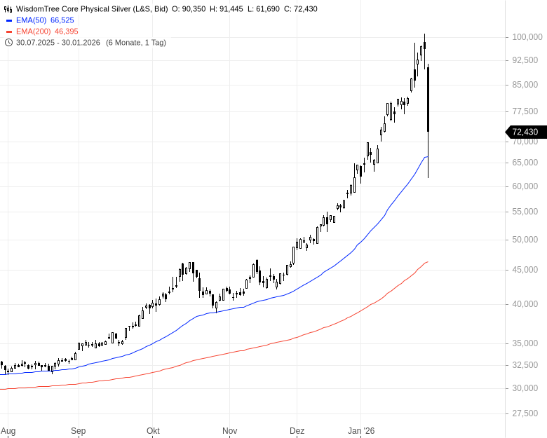 Fazit: Am Silbermarkt kam es am Freitag zum größten Preisrutsch seit mehr als vier Jahrzehnten. Für risikobereite Anleger kann der WisdomTree Core Physical Silver ETC (ISIN: JE00BQRFDY49) eine effiziente Möglichkeit sein, von einer möglichen technischen Gegenbewegung zu profitieren. Die physische Hinterlegung, die günstige Kostenstruktur und die Handelbarkeit an europäischen Börsen machen den ETC zu einem geeigneten Instrument für kurzfristige Rebound-Strategien oder langfristige Beimischungen im Edelmetallbereich.