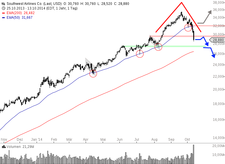 Wir möchten uns hier nicht an irgendwelchen Spekulationen beteiligen (Stichwort Ebola), wir konzentrieren uns auf das was wir sehen können: den Chart. Der Kursverlauf der Southwest Airlines Aktie zeigt eine Rally von mehr als 300 % in den vergangenen 24 Monaten. Ausgehend von dem Bereich 8,00 – 9,00 $ im Herbst 2012 legte der Wert bis auf über 35,00 $ zu. Die Interpretation der aktuellen Nachrichtenlage ist da natürlich hervorragend geeignet um Gewinne einzuloggen.