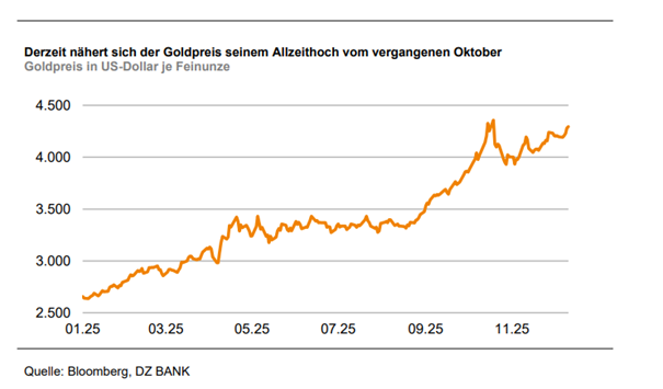 Nach mehreren Wochen volatiler Seitwärtsbewegung zeigt sich der Goldpreis derzeit von seiner starken Seite. So stieg der Preis für eine Feinunze des gelben Edelmetalls innerhalb von zwei Handelstagen um mehr als 2,5% und notiert aktuell bei rund 4.350 US-Dollar. Damit flirtet der Goldpreis mit seinem Allzeithoch vom vergangenen Oktober bei 4.378 US-Dollar. Ausgangspunkt der jüngsten Aufwärtsbewegung war die Sitzung der US-Notenbank vom 10. Dezember, die zwar keine Überraschung in der Höhe der Leitzinssenkung, jedoch hinsichtlich der Tonalität der geldpolitischen Kommunikation brachte.