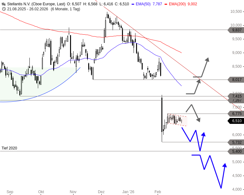 Damit wurde der große Abwärtstrend fortgesetzt, der aufgrund einer kurzfristigen Rounding-Bottom-Erholung im vergangenen Jahr im Bereich von 7,26 EUR noch unterbrochen worden war. Mit dem Abverkauf vom 6. Februar wurde auch das Ausdehnungsziel aus meiner letzten Stellantis-Chartanalyse fast erreicht und ausgehend von einem Tief bei 5,73 EUR die Chance auf eine kurzfristige Erholung genutzt. Dieser kleine Anstieg steht jetzt auf dem Prüfstand.
