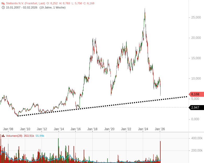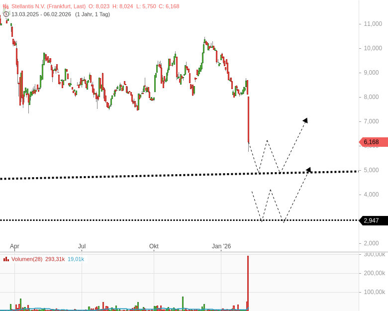 Der Aktienkurs ist gestern um 23% auf 6,168 EUR eingebrochen. Man beachte den Volume-Spike im Chart. Der größte Schock für Anleger: Die Dividende für 2026 wurde komplett gestrichen. Im 5,00 EUR Bereich hat die Aktie einen Key Support. Hier verläuft eine sehr flache langfristige Unterstützungslinie, hier steigt die Wahrscheinleichtkeit für Kursstabilisierungsversuche, die wir uns genau anschauen werden. Aus Stabilisierungsversuchen können echte Bodenbildungsprozesse entstehen. Sollte der 5,00 EUR-Bereich nicht halten, würde bei 2,95 EUR die nächste relevante Unterstützung im Markt liegen.