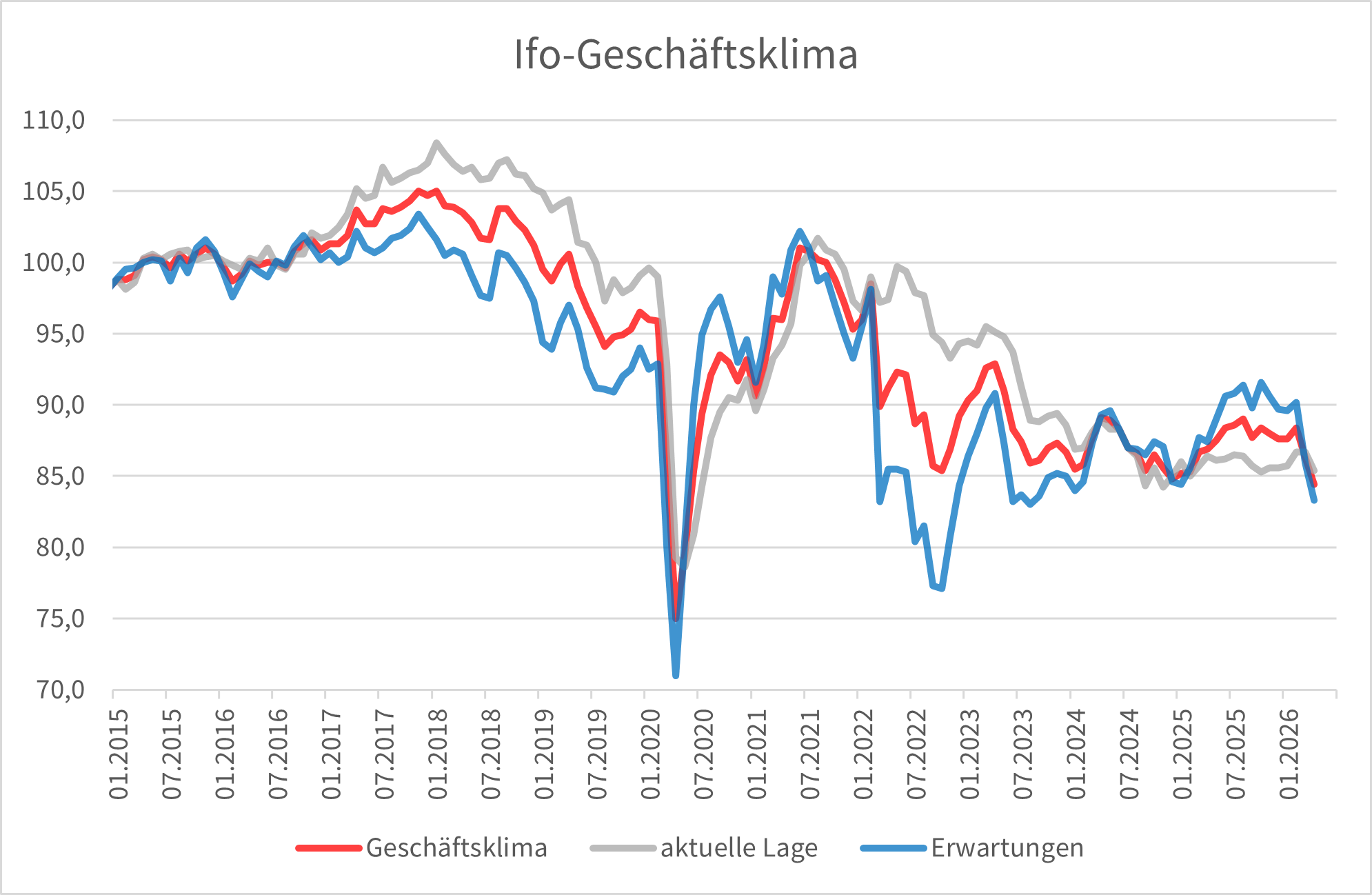 Die Stimmung in der deutschen Wirtschaft hat sich im April weiter eingetrübt. Der Ifo-Geschäftsklimaindex sank von revidiert 86,3 Punkten im Vormonat auf 84,4 Zähler, wie das Ifo-Institut am Freitag mitteilte. Erwartet wurde ein weniger starker Rückgang auf 85,7 Punkte.