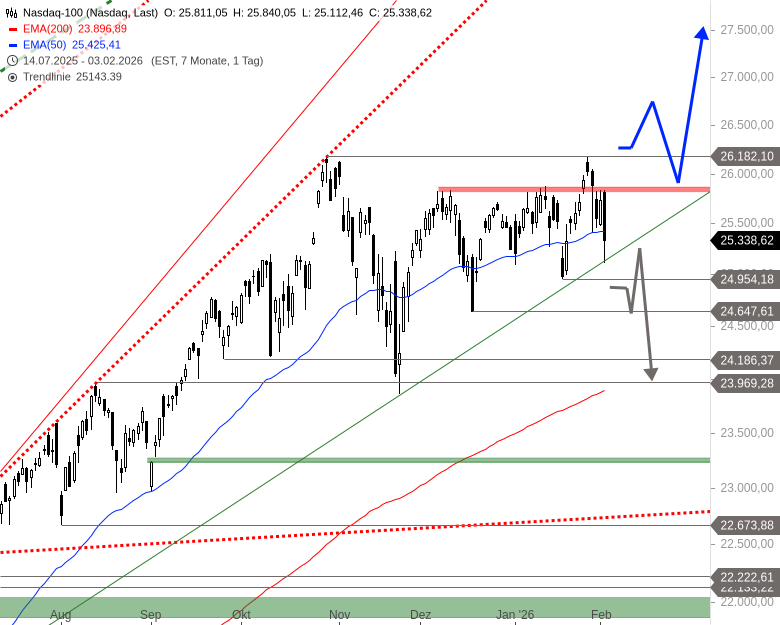 Der Nasdaq 100 prallte am 28. Januar am Allzeithoch bei 26.182 Punkten nach unten ab. Das kurzfristige 61,8 %-Retracement bei 25.409 Punkten bot zunächst mehrfach Halt, aber gestern fiel diese Unterstützung und der Index sank auf 25.112 Punkte. Im späten Handel setzte eine leichte Erholung ein, die sich außerbörslich fortsetzte. Der Nasdaq 100 wird vorbörslich 58 Punkte über dem Vortag getaxt.