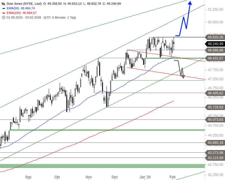 Der Dow Jones befindet sich seit 07. April 2025 in einer Aufwärtsbewegung. Am 22. August 2025 brach der Index über das alte Rekordhoch bei 45.073 Punkten aus und generierte damit ein großes Kaufsignal. Seitdem stieg der Index weiter an, erreichte mehrere neue Allzeithochs und bewegte sich ab dem 07. Januar 2026 zwischen 49.621/633 und 48.431 Punkten seitwärts.