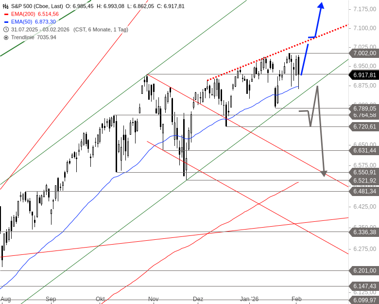 Innerhalb der Flagge gab es eine Serie aufsteigender Tiefs, aktuell ist der Aufwärtstrend intakt. Erst mit einer Unterschreitung von 6.789 Punkten wäre diese Serie gebrochen und eine Korrektur in Richtung 6.550 bis 6.521 Punkte möglich. Solange höhere Tiefs entstehen, sind weitere Anstiege bis 7.039 und 7.200 Punkte möglich.