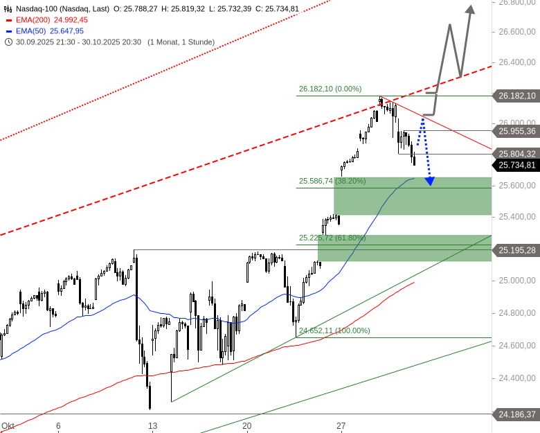 Der Nasdaq 100 setzte gestern seine kurzfristige Konsolidierung fort. Zunächst fiel er auf 25.804 Punkte zurück, konnte sich danach auf 25.955 Punkte erholen. In der zweiten Handelshälfte kam es jedoch zu erneuten Abgaben. Der Index unterschritt sein vorheriges Tagestief und fiel auf 25.732 Punkte. Damit war der Weg für eine weitere Konsolidierung grundsätzlich geebnet. Nach Börsenschluss sorgten jedoch die positiven Quartalszahlen von Amazon und Apple für Auftrieb im außerbörslichen Handel.