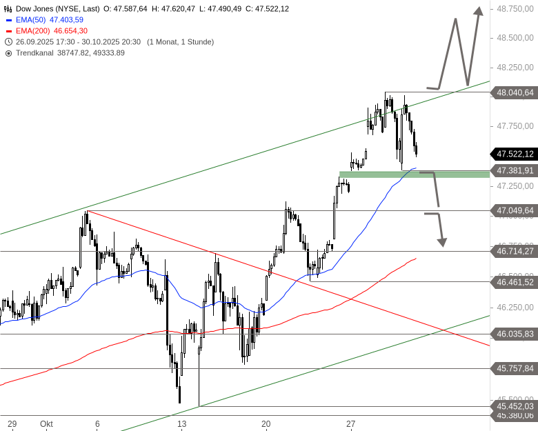 Kurzfristig befindet sich der Dow Jones in einer Seitwärtsbewegung zwischen 48.040 und 47.381 Punkten. Ein Ausbruch über das obere Ende dieser Spanne könnte eine Fortsetzung der Rally ermöglichen, mit Ziel in Richtung 49.300 Punkte. Fällt der Index hingegen unter das untere Ende der Range, wären zunächst Rücksetzer bis 47.049 Punkte möglich. Bei weiterem Abgabedruck könnte auch das Niveau bei 46.731 Punkten wieder in den Fokus rücken. Der Index braucht klare Impulse für einen Richtungsentscheid.