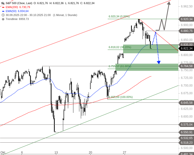 Der S&P 500 zeigte ein ähnliches Verhalten wie der Nasdaq 100. Nach einer schwachen Eröffnung fiel der Index zunächst auf ein Tagestief bei 6.835 Punkten, konnte sich dann aber auf 6.880 Punkte erholen. In der zweiten Tageshälfte kam es zu erneuten Abgaben, bei denen sogar ein neues Tief bei 6.820 Punkten markiert wurde. Insgesamt bleibt das kurzfristige Bild angeschlagen. Positiv zu werten ist allerdings die Erholung im nachbörslichen Handel, die eine Stabilisierung andeutet.