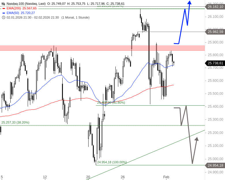 Der Nasdaq 100 scheiterte am 28. Januar 2026 am Allzeithoch bei 26.182 Punkten und fiel anschließend auf das 61,8 %-Retracement bei 25.409 Punkten zurück. Ein erster Rallyversuch von dort war nicht durchsetzungsstark, der Index kam erneut fast bis zu diesem Niveau zurück. Gestern folgte eine weitere Erholung, wobei der Index sich von dieser Marke lösen konnte.