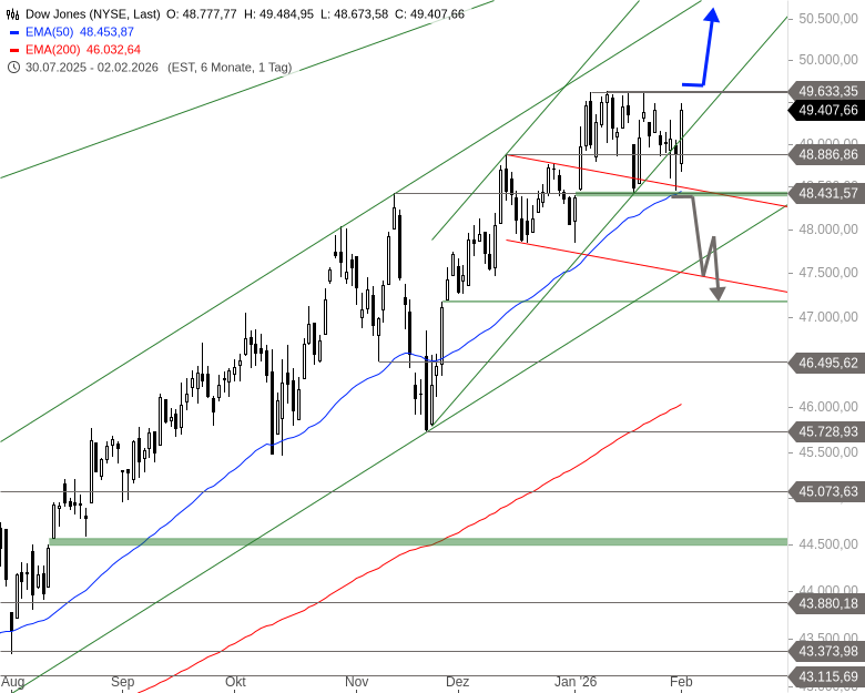 Ein Ausbruch nach oben aus dieser Bewegung könnte eine Fortsetzung der Rally ermöglichen, Ziele lägen dann bei 50.626 und 51.592 Punkten. Sollte der Index unter 48.431 Punkte fallen, drohen weitere Abgaben bis vorerst 47.182 Punkte. Damit bleibt die aktuelle Range die maßgebliche Entscheidungszone für die nächsten Bewegungen im Dow Jones.
