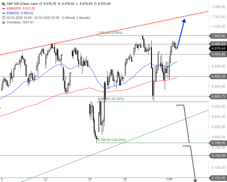 Der S&P 500 erreichte am 28. Januar 2026 das Allzeithoch bei 7.002 Punkten und fiel in der Folge auf das 61,8 %-Retracement bei 6.869 Punkten zurück. Anschließend zeigte der Index einen volatilen Verlauf und bewegte sich in einer deutlichen Erholung zuletzt wieder in Richtung seines Rekordhochs, wobei er erneut Schwung aufnahm.