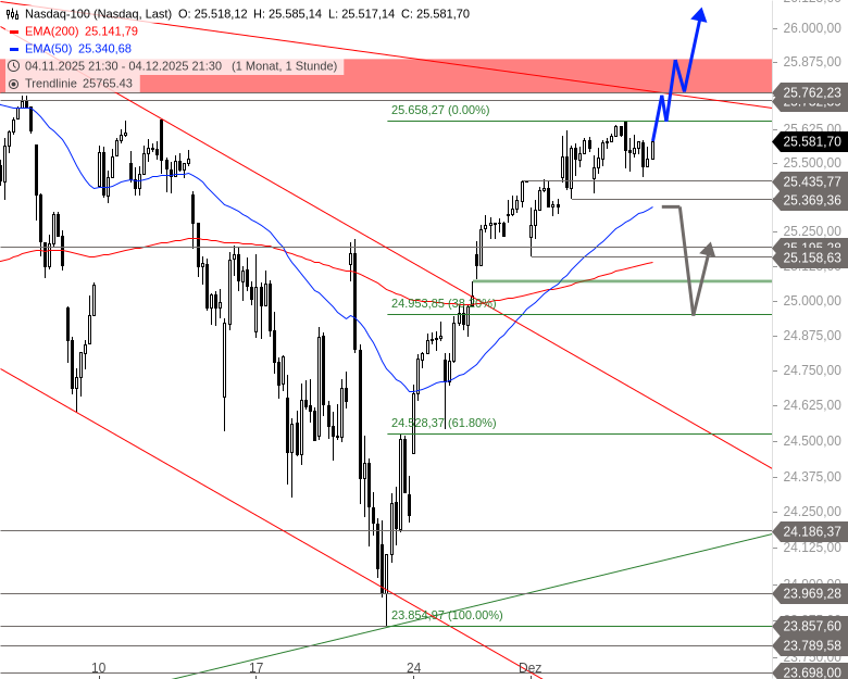 Der Nasdaq 100 hat weiterhin Chancen auf eine Jahresendrally. Ein Anstieg über 25.762 Punkte würde das bullische Szenario untermauern, mit Folgepotenzial bis 26.182 und 27.500 Punkte. Ein Rückfall unter 25.369 Punkte hingegen spräche für einen Umweg über 24.953 Punkte. Auch dann bliebe das mittelfristige Kursziel bestehen. Der Index zeigt damit kurzfristig Konsolidierungscharakter, bleibt aber übergeordnet in einer Aufwärtsstruktur.