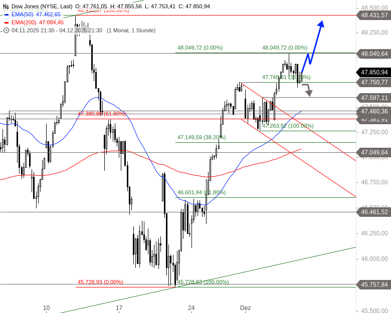 Der Dow Jones erreichte gestern ein Hoch bei 48.049 Punkten, bevor Gewinnmitnahmen einsetzten und den Kurs kurzfristig unter das Zwischenhoch bei 47.750 Punkten drückten. Im späten Handel machte der Index einen Großteil der Verluste wieder wett und schloss knapp oberhalb dieser Marke. Der Tagesverlauf zeigte keine Anzeichen einer Topbildung, weshalb die laufende Rally aus technischer Sicht weiterhin als intakt einzustufen ist.