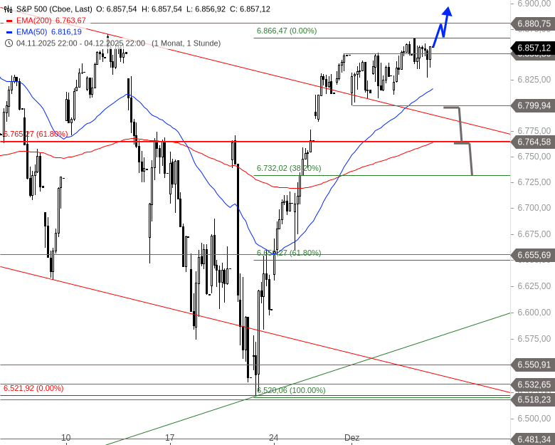 Der S&P 500 stieg gestern früh bis auf 6.866 Punkte, pendelte danach aber um das Hoch vom 28. November bei etwa 6.850 Punkten. Die Unterstützungsmarke bei 6.799 Punkten wurde nicht getestet. Der Index behauptete sich sogar deutlich oberhalb des EMA50 auf Stundenbasis, der aktuell bei 6.816 Punkten verläuft. Das technische Bild zeigt damit eine stabile Konsolidierung auf hohem Niveau.