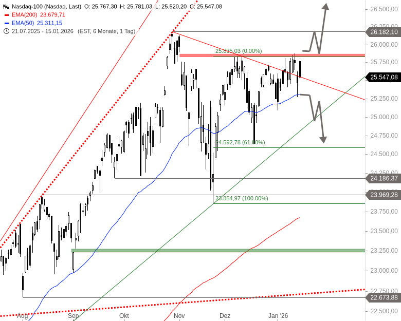 Seit Tagen pendelt der Nasdaq 100 um den Abwärtstrend seit dem Allzeithoch. Ein Ausbruch über 25.835 Punkte würde Potenzial bis 26.182, 27.500 oder knapp 28.000 Punkte eröffnen. Ein Rückfall unter den EMA50 (Tagesbasis) per Tagesschlusskurs könnte hingegen Abgaben bis 24.592 Punkte auslösen.