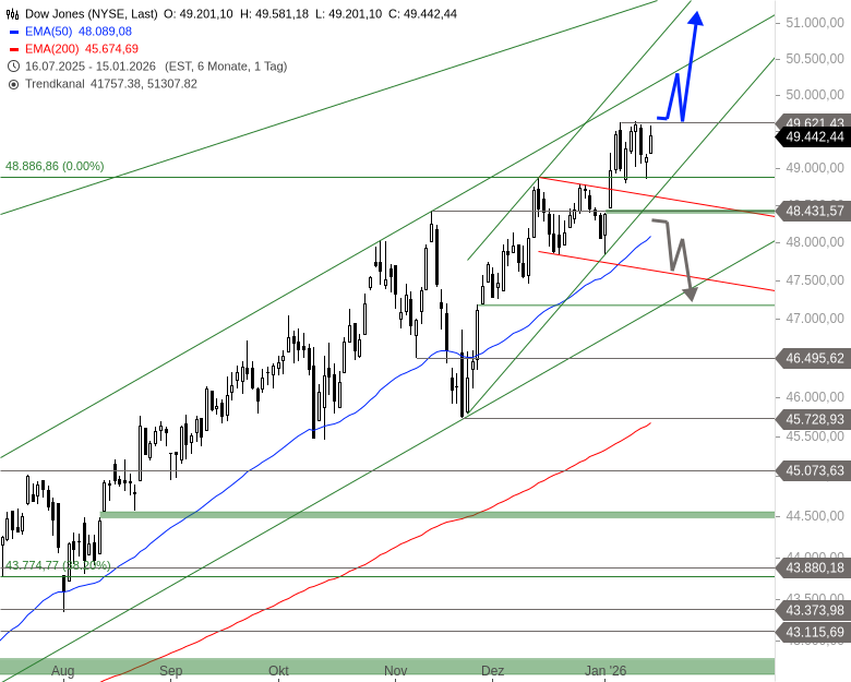 Die Chancen auf eine Rally in Richtung 50.179 und 51.331 Punkte bestehen weiter. Mittelfristig bleibt das Ziel oberhalb von 55.000 Punkten offen. Erst ein Rückfall unter 48.431 Punkte würde das Chartbild deutlich eintrüben und weitere Abgaben bis 47.182 Punkte möglich machen.