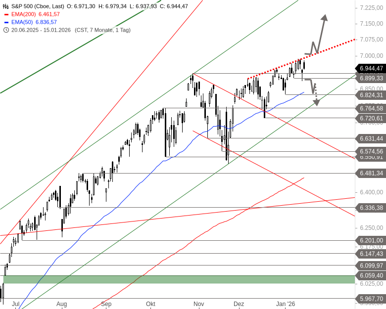 Ein Ausbruch über 6.996 Punkte könnte neue Dynamik bringen und Kursziele bei 7.052 und 7.200 Punkten freisetzen. Ein Tagesschluss unter 6.899 Punkten würde eine Bewegung in Richtung 6.824 und eventuell 6.764 Punkte nach sich ziehen.