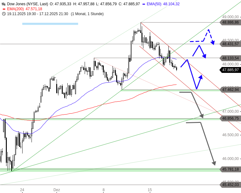 Heute könnten die Bullen zunächst eine Stabilisierung versuchen. Doch erst oberhalb von 48.133 bis 41.200 Punkten wäre ein kleineres Kaufsignal gelungen und ein Ausbruch aus der kurzfristigen Flaggenformationen in Richtung 48.431 Punkte möglich. Bis dahin ist dort mit dem Start des nächsten Einbruchs zu rechnen. Oberhalb von 48.500 Punkten wäre ein Anstieg bis 48.750 Punkte als Teil eines finalen Aufwärtsimpulses denkbar.