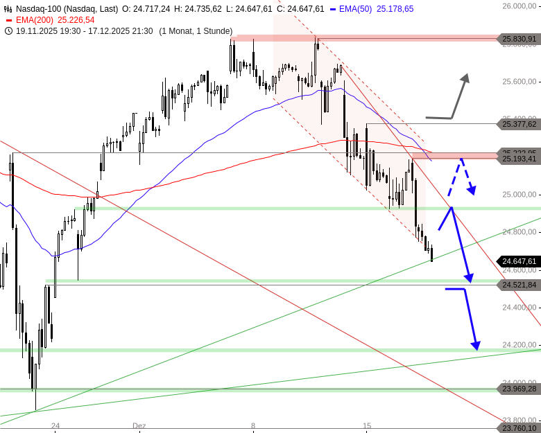Einem kurzen Aufbäumen Richtung 25.222 Punkte folgte beim Nasdaq 100 Index gestern ein weiterer scharfer Abverkauf. Dieser führte entlang der Unterseite des übergeordneten Flaggenkanals bis an die kurzfristige Aufwärtstrendlinie auf Höhe von 24.650 Punkten. Vorbörslich kann sich der Index zunächst deutlich von der Zone lösen.