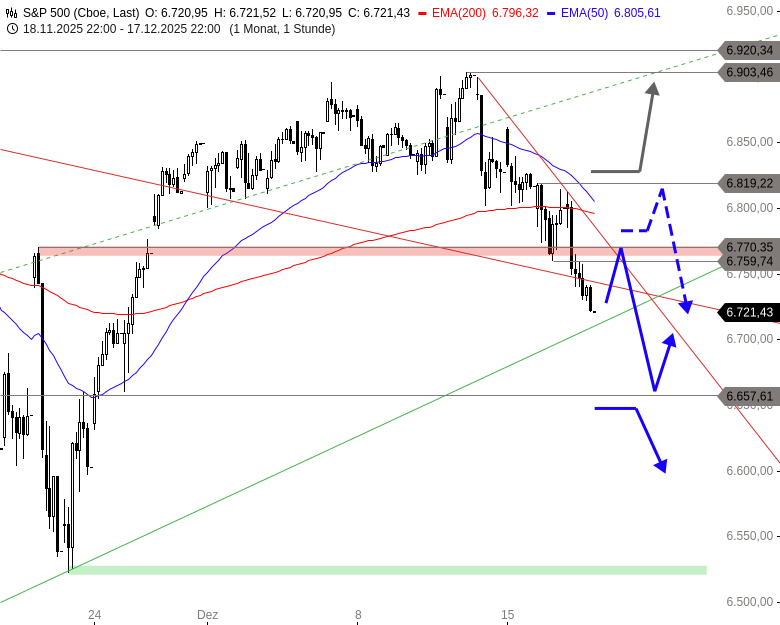Mit dem gescheiterten Ausbruchsversuch über das Vortageshoch bei 6.819 Punkten setzte beim S&P 500 Index ein weiterer Einbruch ein, der nicht nur unter den Support bei 6.759 Punkte, sondern sogar unter die frühere kurzfristige Abwärtstrendlinie zurückführte. Heute müssen die Bullen einen großen Sprung nach oben machen, um Schlimmeres zu verhindern.