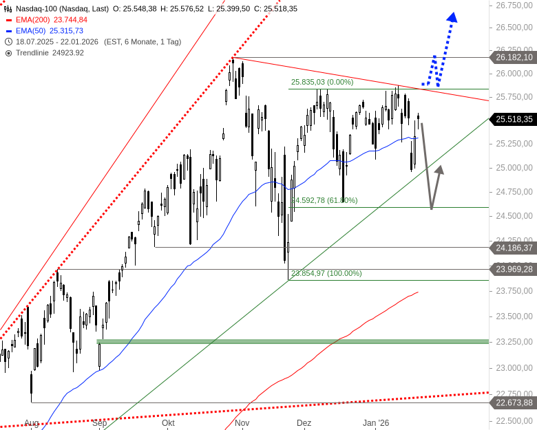 Der Nasdaq 100 korrigiert seit seinem Allzeithoch vom 29. Oktober 2025 in einer mehrmonatigen Konsolidierungsphase. Während das bisherige Tief bei 23.854 Punkten liegt, bildet die Marke von 25.835 Punkten die obere Grenze. Ein drohender Rückfall am Dienstag wurde am Mittwoch postwendend gekontert, als der Index über den EMA50 auf Tagesbasis zurückkehrte. Damit wurde eine potenzielle neue Abwärtswelle innerhalb des Korrekturtrends zunächst unterbunden und die charttechnische Lage stabilisiert.