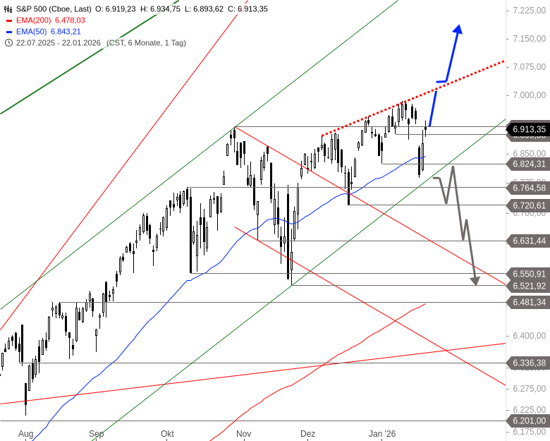 Der S&P 500 bewegt sich aktuell in einer kurzfristigen Konsolidierung innerhalb eines intakten Aufwärtstrends, wobei die Dynamik spürbar nachlässt. Gestern verteidigte der Index mit einer kleinen Unsicherheitskerze das Kursniveau am alten Allzeithoch aus dem Oktober bei 6.920 Punkten. Obwohl die bullische Flagge bereits Ende November nach oben aufgelöst wurde und seitdem mehrfach neue Höchststände erreicht wurden, verhindert eine obere Pullbacklinie bei aktuell 7.010 Punkten einen stärkeren Durchmarsch.