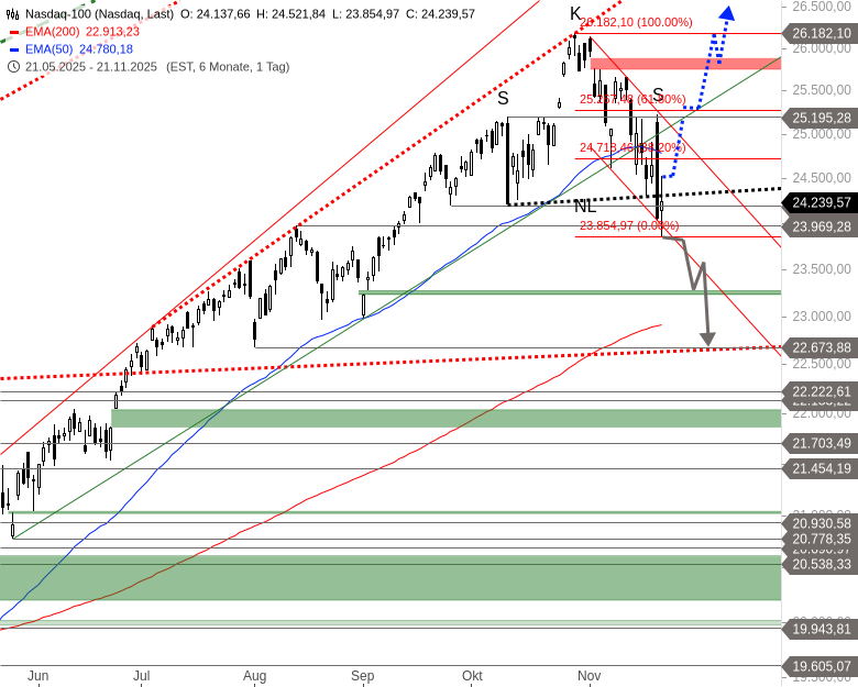 Die Lage bleibt angespannt: Ein Bruch des Freitagstiefs dürfte einen panikartigen Abverkauf in Richtung 22.673 Punkte auslösen. Das würde die SKS bestätigen. Gelingt hingegen ein Ausbruch über 24.521 Punkte, könnte ein Anstieg bis 25.267 Punkte folgen. Ein Durchbruch darüber würde die bullische Flagge aktivieren und die Tür für eine Rally bis zum Allzeithoch und darüber hinaus bis 27.500 Punkte öffnen.