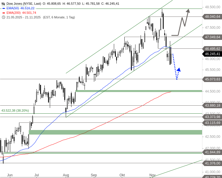 Erst ein Anstieg über 47.049 Punkte würde ein frisches Long-Signal erzeugen. In diesem Fall wären Kursziele bei 48.040 und dem Allzeithoch bei 48.431 Punkten denkbar. Solange diese Marke nicht überschritten wird, überwiegt das Risiko einer Fortsetzung der Korrektur mit möglichen Zielen bei 45.470 und 45.073 Punkten.