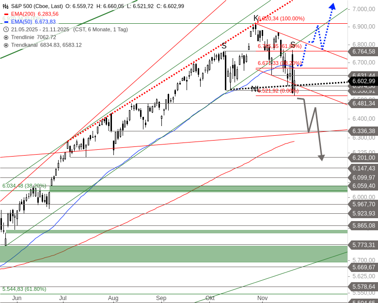 Der S&P 500 befindet sich seit dem Allzeithoch bei 6.829 Punkten in einer Abwärtsbewegung, die als bullische Flagge interpretiert werden kann. Am Donnerstag rutschte der Index aus dieser Flagge heraus, kehrte aber am Freitag wieder hinein zurück. Ein Ausbruch nach oben ist erst möglich, wenn der übergeordnete Abwärtstrend durchbrochen wird. Alternativ lässt sich wie beim Nasdaq 100 eine SKS-Topformation erkennen. Am Donnerstag fiel der Index unter die Nackenlinie ab, kehrte aber am Freitag wieder darüber zurück.